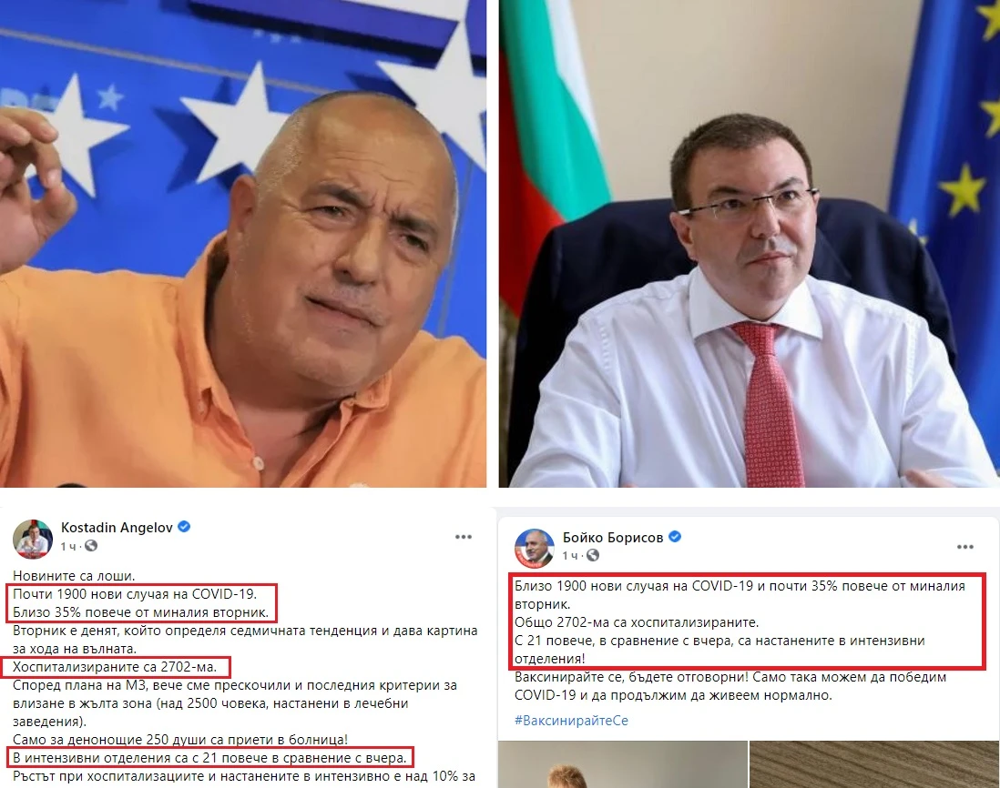 „Близо 1900 нови случая на COVID-19 и почти 35% повече от миналия вторник. Общо 2702-ма са хоспитализираните. С 21 повече, в сравнение с вчера, са настанените в интензивни отделения!“, пишат и двамата в профилите си в социалната мрежа „Фейсбук“.