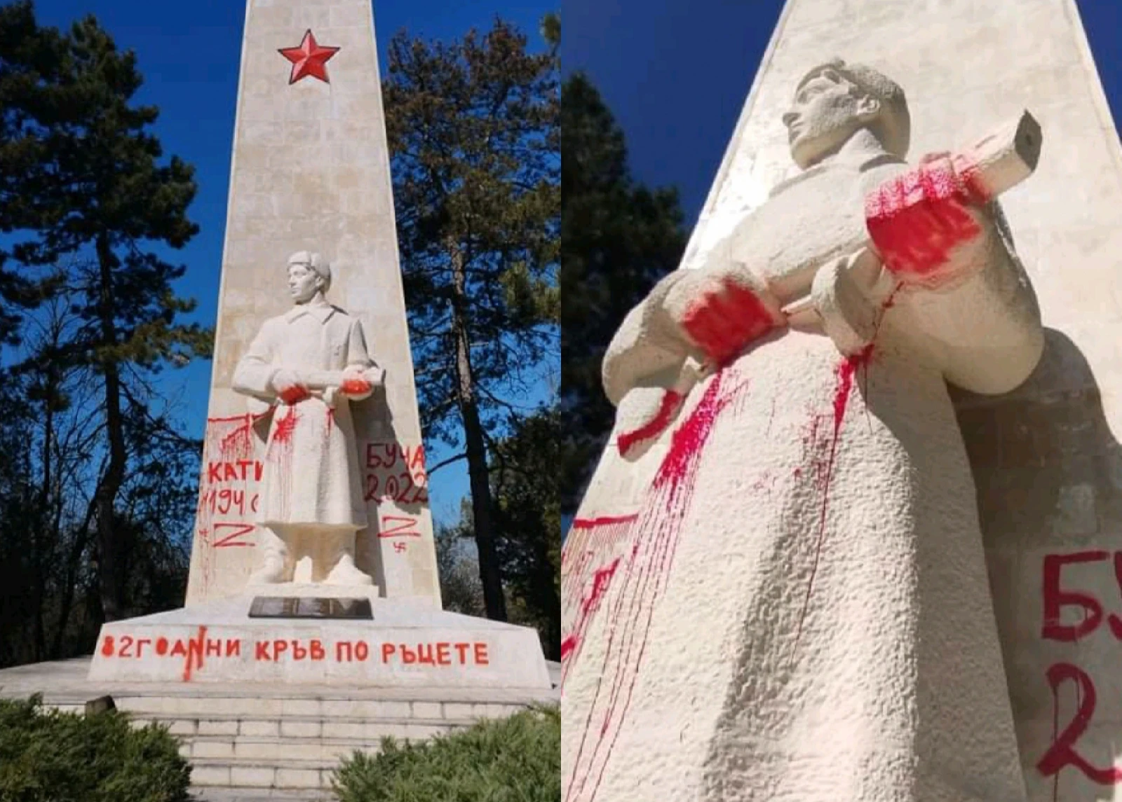 Паметникът в Добрич осъмна нацапан миналата сряда. Засега все още неизвестните извършители  написали с червена боя „Катин 1940 – Буча 2022”, „82 години кръв по ръцете”, както и ален знак Z.