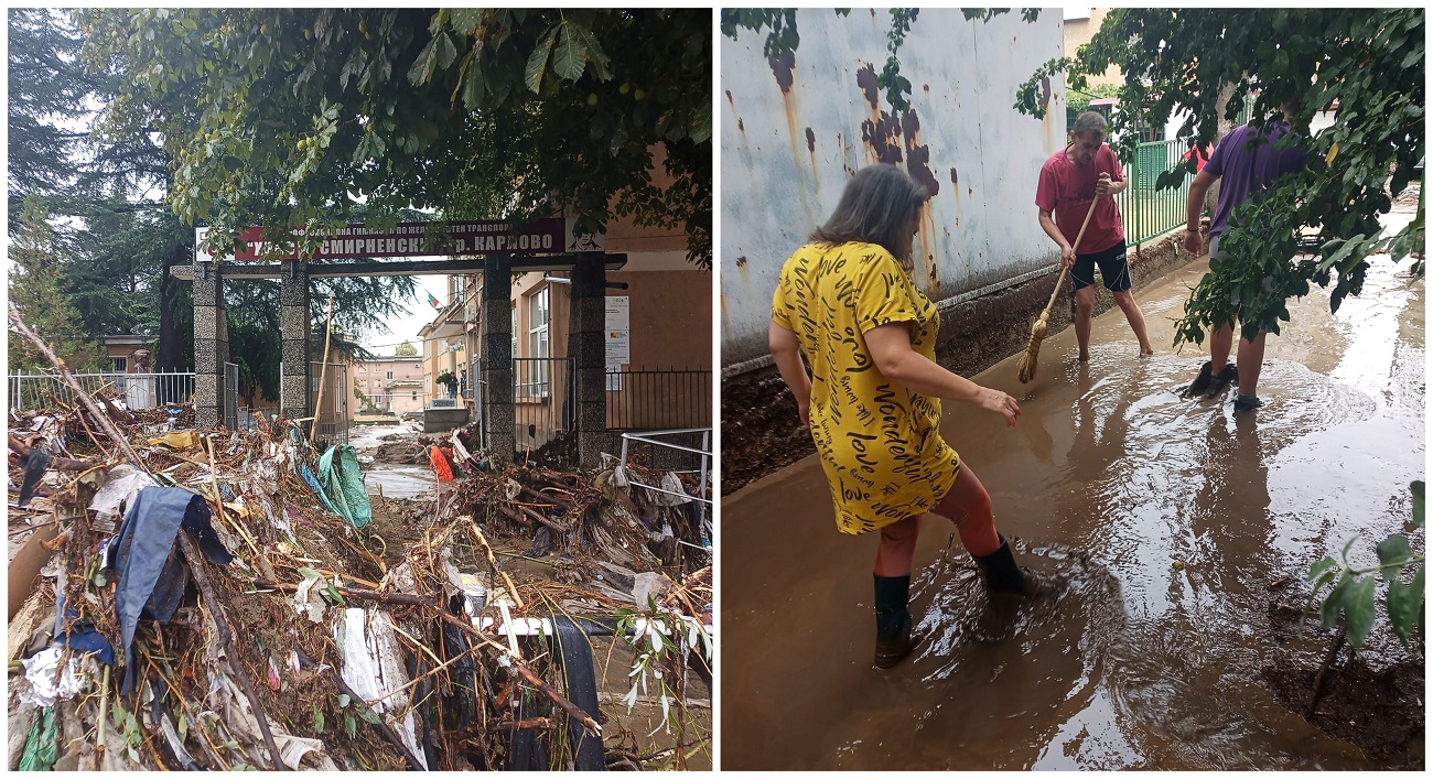 Професионална Гимназия по Железопътен Транспорт „Христо Смирненски“ в Карлово затъна във вода и кал. Стотици предмети бяха донесени от водата до главния вход и в двора на гимназията.