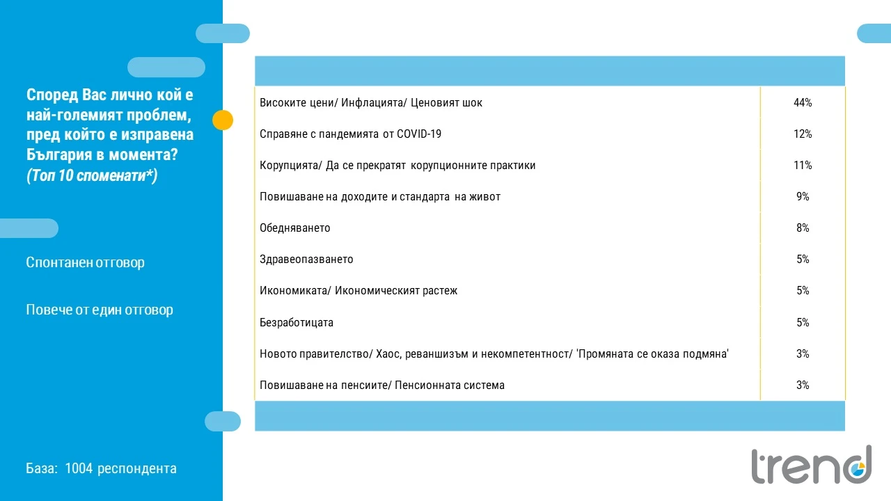 Зададохме и отворен въпрос (без предварително зададени опции) към респондентите да посочат кой според тях е най-големият проблем пред България в момента. Като открояващ се лидер се очертава проблемът с високите цени (44 процентни пункта) с три пъти повече посочвания от втория – пандемията от COVID-19 (12 процентни пункта). На трето място се нарежда корупцията с 11 процентни пункта. По-надолу продължават да доминират социалните проблеми – повишаване на доходите, обедняването и здравеопазването.
