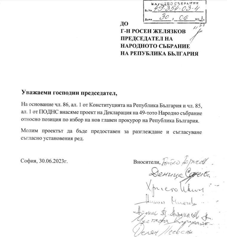 „Отправяме своя призив към Висшия съдебен съвет да спре процедурата по избор на нов главен прокурор до окончателното произнасяне на Конституционния съд, както и до окончателното приемане на предвижданите промени в Конституцията на Република България“, се казва в документа.