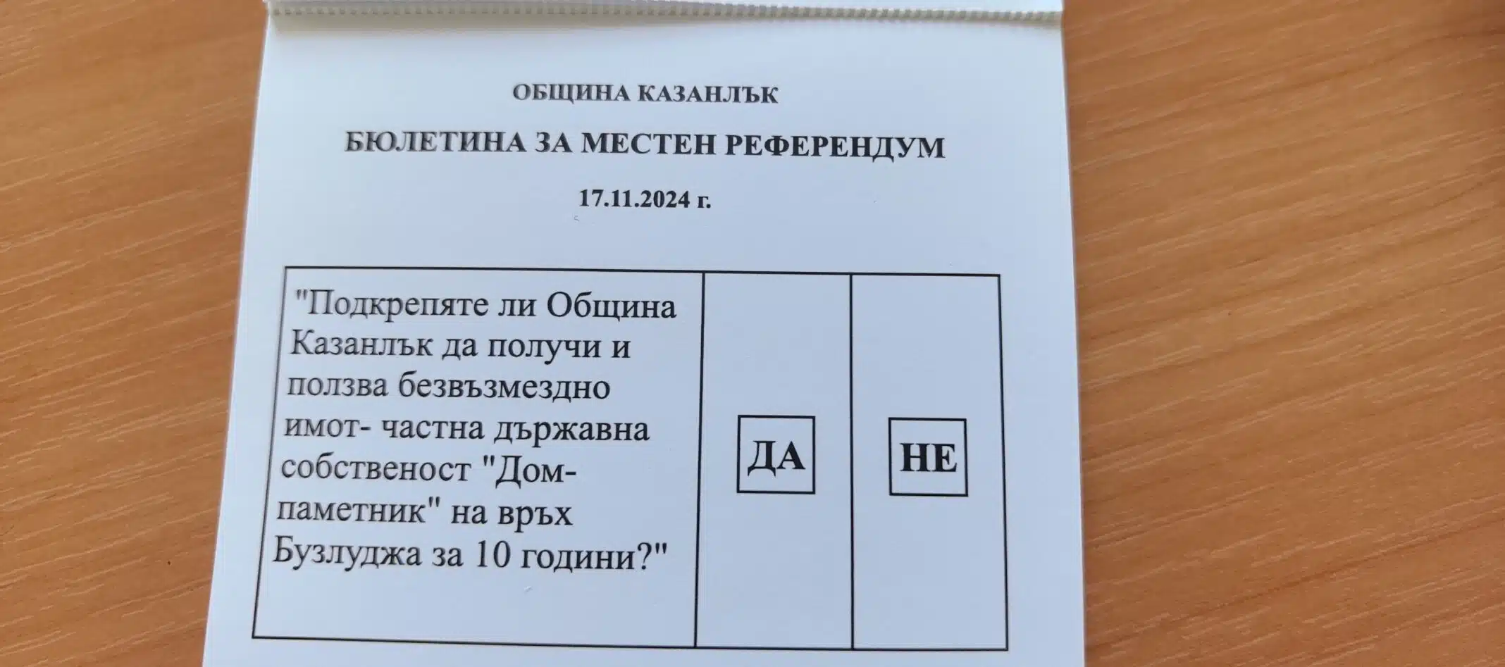 „Подкрепяте ли Община Казанлък да получи и ползва безвъзмездно имот – частна държавна собственост „Дом-паметник“ на връх Бузлуджа за 10 години?“ На този въпрос отговарят на днешния местен референдум жителите на община Казанлък.