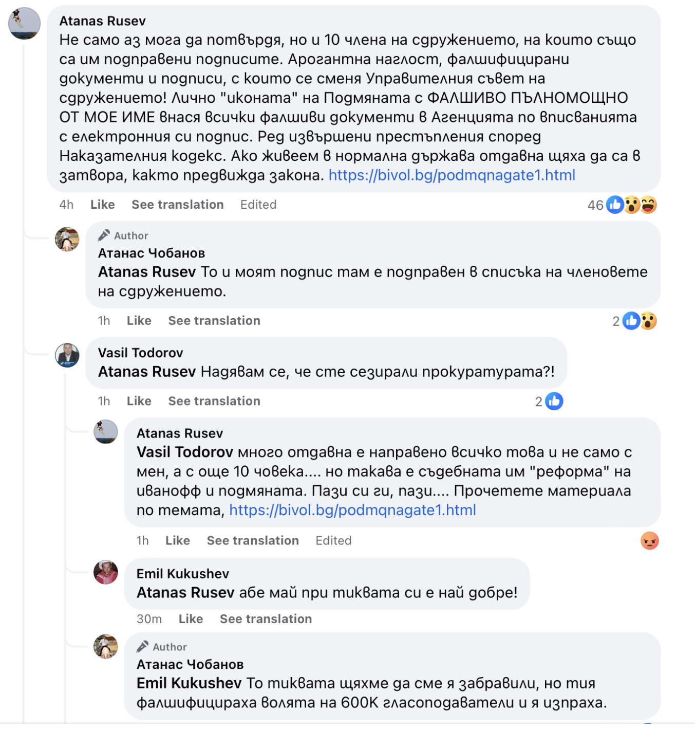 „Не само аз мога да потвърдя, но и 10 члена на сдружението, на които също са им подправени подписите. Арогантна наглост, фалшифицирани документи и подписи, с които се сменя Управителния съвет на сдружението! Лично „иконата“ на Подмяната с ФАЛШИВО ПЪЛНОМОЩНО ОТ МОЕ ИМЕ внася всички фалшиви документи в Агенцията по вписванията с електронния си подпис. Ред извършени престъпления според Наказателния кодекс. Ако живеем в нормална държава отдавна щяха да са в затвора, както предвижда закона.