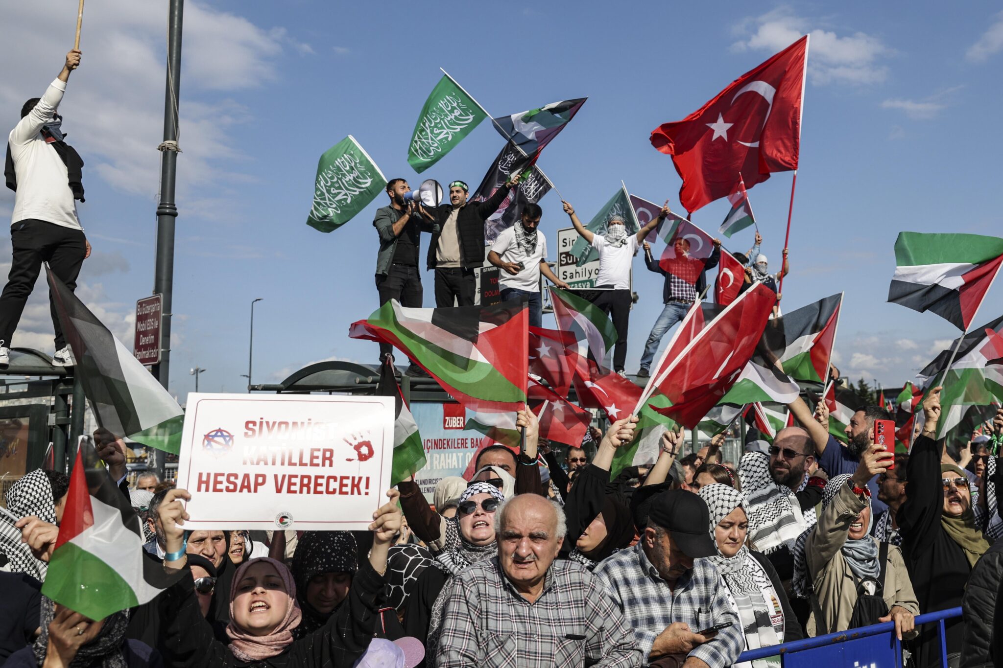 Най-големият протест се проведе в Истанбул, където кадри показаха многолюдни тълпи, които вървяха от „Света София“ до бреговете на Златния рог. Там те бяха посрещнати от десетки лодки, окичени с турски и палестински знамена. Участниците призоваха за мюсюлманска солидарност с палестинците след общите молитви пред бившата катедрала, превърната в джамия.