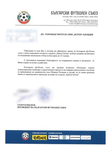 Обръщаме се към Вас в отговор на официално писмо до Български футболен съюз, с което изразявате готовност стадион „Христо Ботев“ да бъде домакин на мачовете на младежкия национален отбор на България до 21 години.