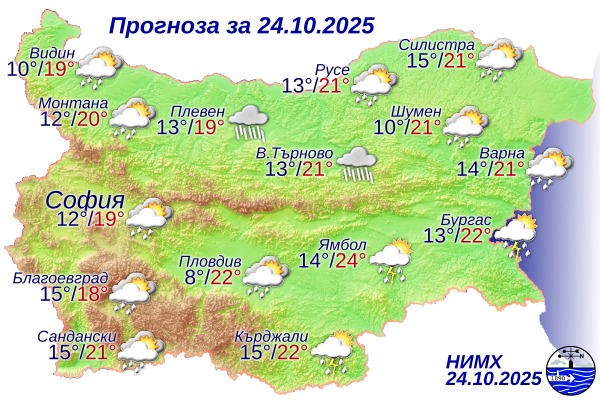 За 24 октомври синоптиците обявиха жълт код за потенциално опасно време в почти цялата страна. Ще бъде ветровито, с вятър от запад-северозапад, който ще е умерен, а в Дунавската равнина и Горнотракийската низина – силен. Предупреждението е в сила навсякъде, с изключение на Перник, Кюстендил и Благоевград.