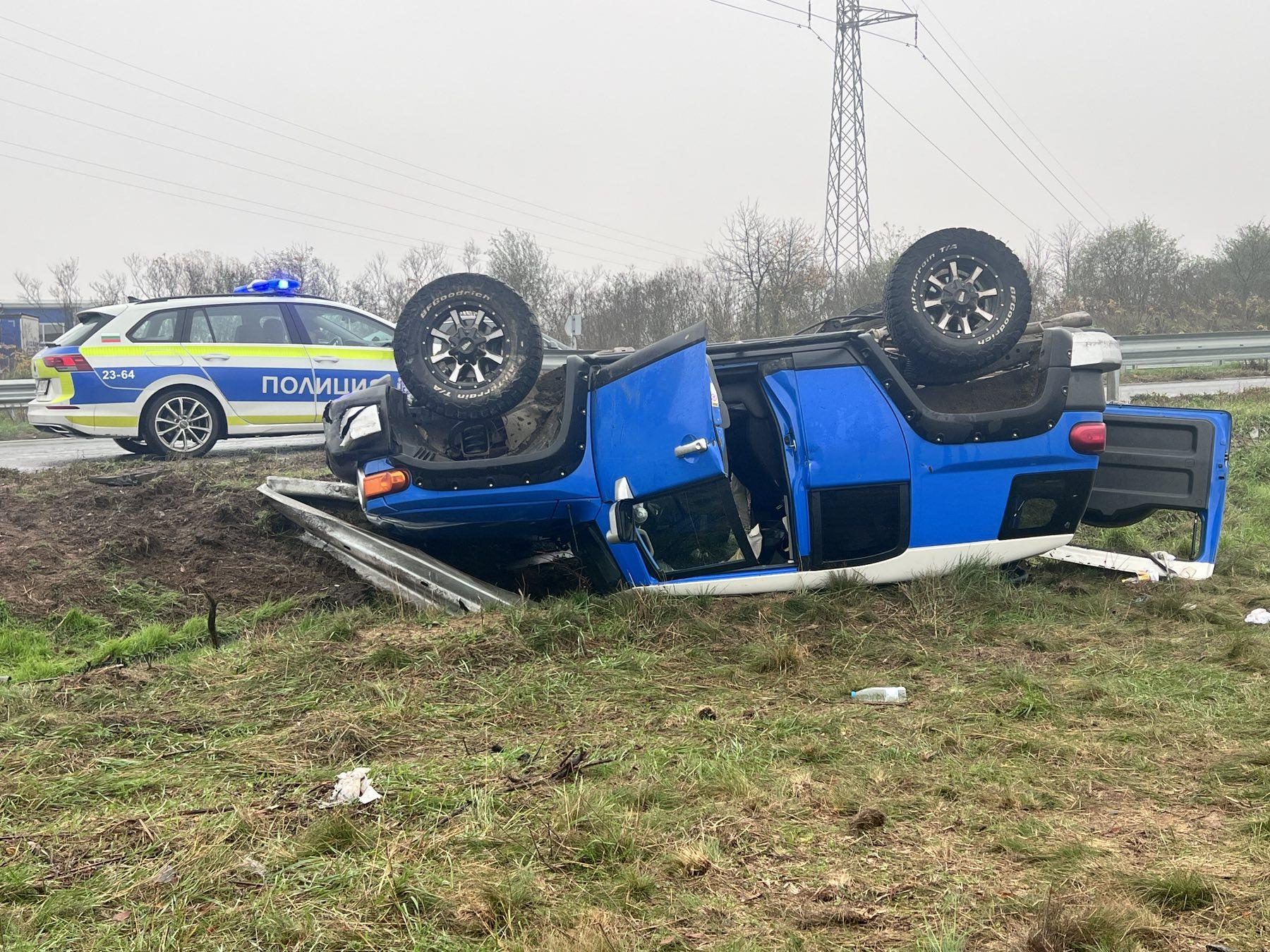 Инцидентът е станал около 09:46 часа в района на пътния възел при село Ягода, в посока Стара Загора. По първоначални данни водачът е изгубил контрол над автомобила, който се е преобърнал извън пътното платно.