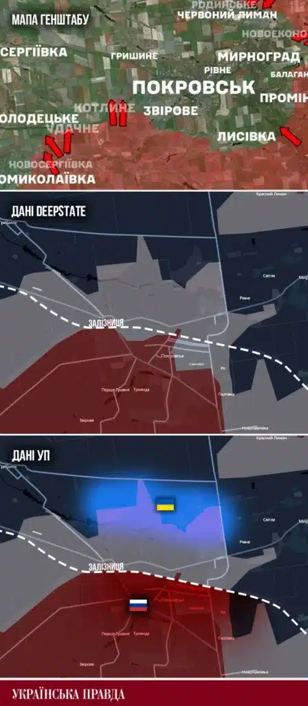 „Покровск е до голяма степен загубен. Все още има украински позиции в северните покрайнини на града; по-голямата част от Покровск обаче е под контрола на окупаторите. Цялата част от града под железопътната линия, която „разделя“ града наполовина, според УП, е под контрола на руснаците. Линията на боен контакт минава почти по северните покрайнини на града. Картата на Генералния щаб в посока Покровск изостава от реалността с поне един месец (първата карта долу – бел.ред.)“.