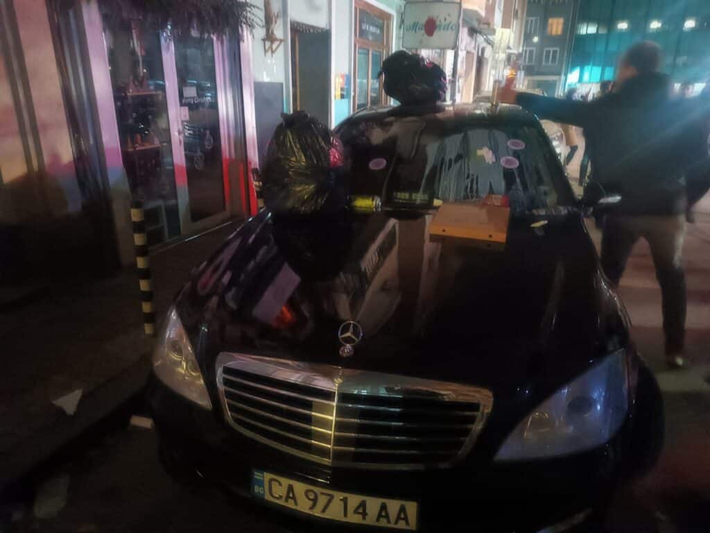 Тази вечер протестиращи изхвърлиха боклук и налепиха стикери върху автомобил, който се предполага, че е на НСО или на депутат, който се е опитвал да се измъкне от протеста. Десетки граждани заобиколиха автомобила и скандираха „Оставка“ докато той се опитваше да пробие живата верига около парламента.