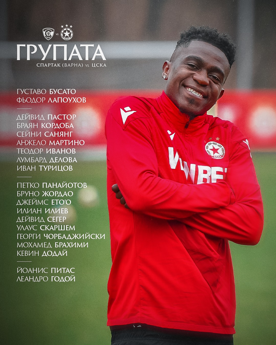 Групата на ЦСКА: 1. Густаво Бусато, 21. Фьодор Лапоухов, 2. Дейвид Пастор, 13. Браян Кордоба, 3. Сейни Санянг, 17. Анжело Мартино, 14. Теодор Иванов, 5. Лумбард Делова, 19. Иван Турицов, 30. Петко Панайотов, 6. Бруно Жордао 99. Джеймс Ето’о, 73. Илиан Илиев, 8. Дейвид Сегер, 7. Улаус Скаршем, 16. Георги Чорбаджийски, 11. Мохамед Брахими, 22. Кевин Додай, 28. Йоанис Питас, 9. Леандро Годой.