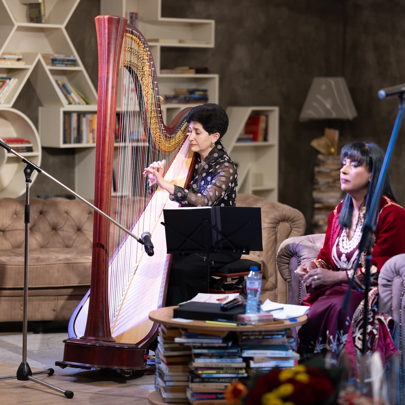 Под нежните звуци на арфата, Оля Ал-Ахмед представи новата си книга „Цвете от куршуми“. В поетично-музикалния спектакъл участва д-р Кохар Андонян Kohi Andonyan – знаково име, преподавател и носител на „Кристална лира” 2025.